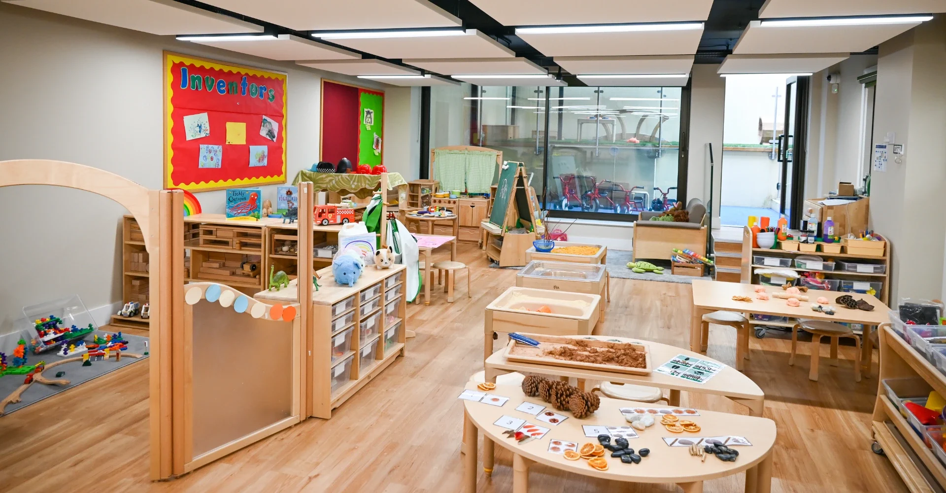 Our bright, modern building features underfloor heating, sensor lighting, and naturally lit play spaces filled with open-ended resources. Outdoors, children enjoy a unique two-storey garden that extends their learning and physical development. From cosy reading corners and mud kitchens to bikes, water play, and a thriving herb garden, the spaces encourages creativity, sustainability, and a love of nature.